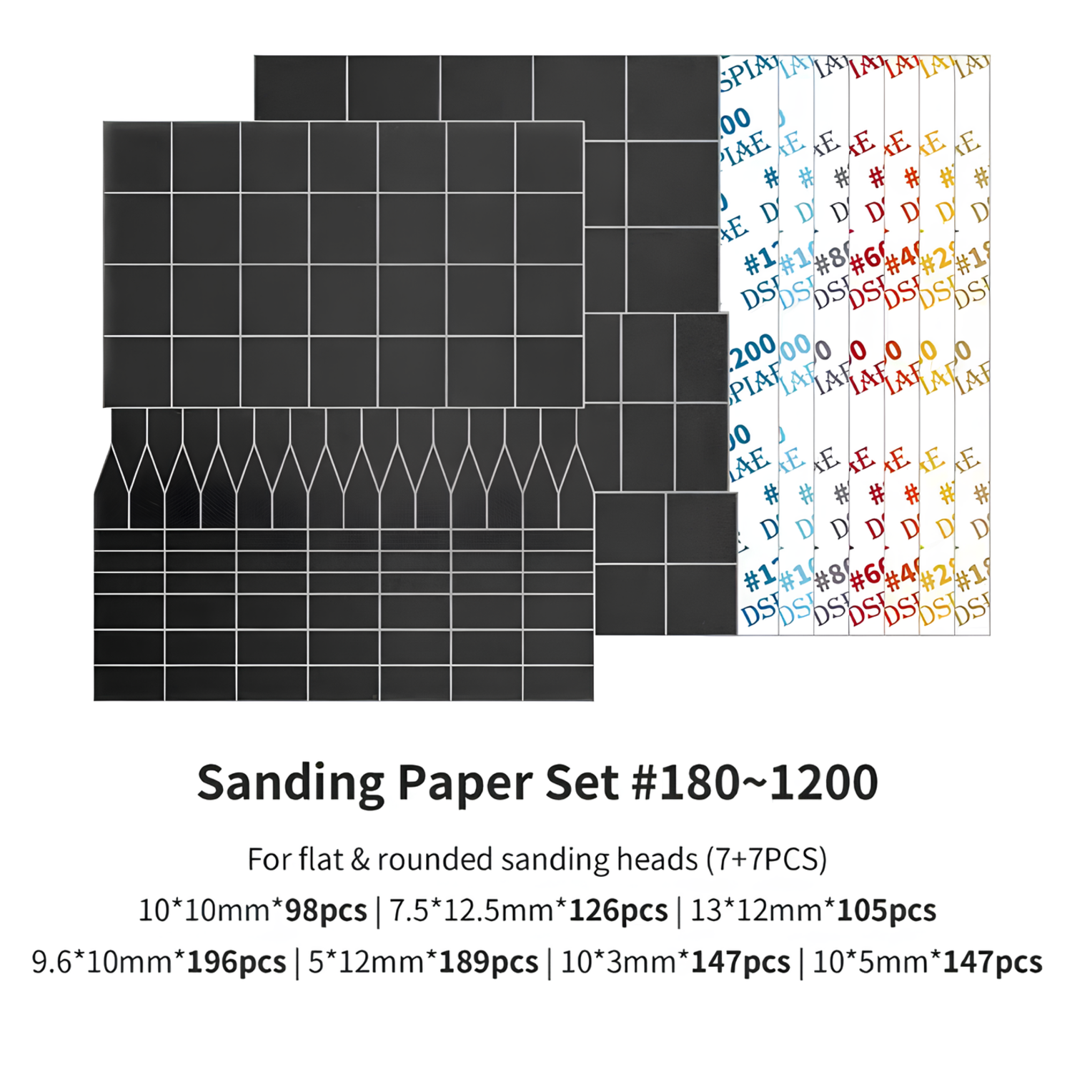 This Sanding Paper Set (#180–1200 grit) is designed for precision sanding of scale models, miniatures, and detailed parts. It includes multiple grit levels for rough shaping, smoothing, and fine finishing. Compatible with both flat and rounded sanding heads, this set is fully compatible with the Mini Electric Sander 2.0, making it perfect for clean, controlled results on plastic, resin, and 3D-printed models.